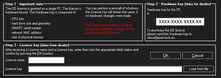 The plug-in works on the basis of an OEM license – it can be run on one computer only and there is no possibility of transferring the plug-in into another PC (it includes changing computer’s components). In this matter, the following are taken into account: information about the CPU, geometry and size of the hard disk, SMART serial number, MAC network address, physical memory size. It is recommended to make hardware changes before purchasing the i2e plug-in.